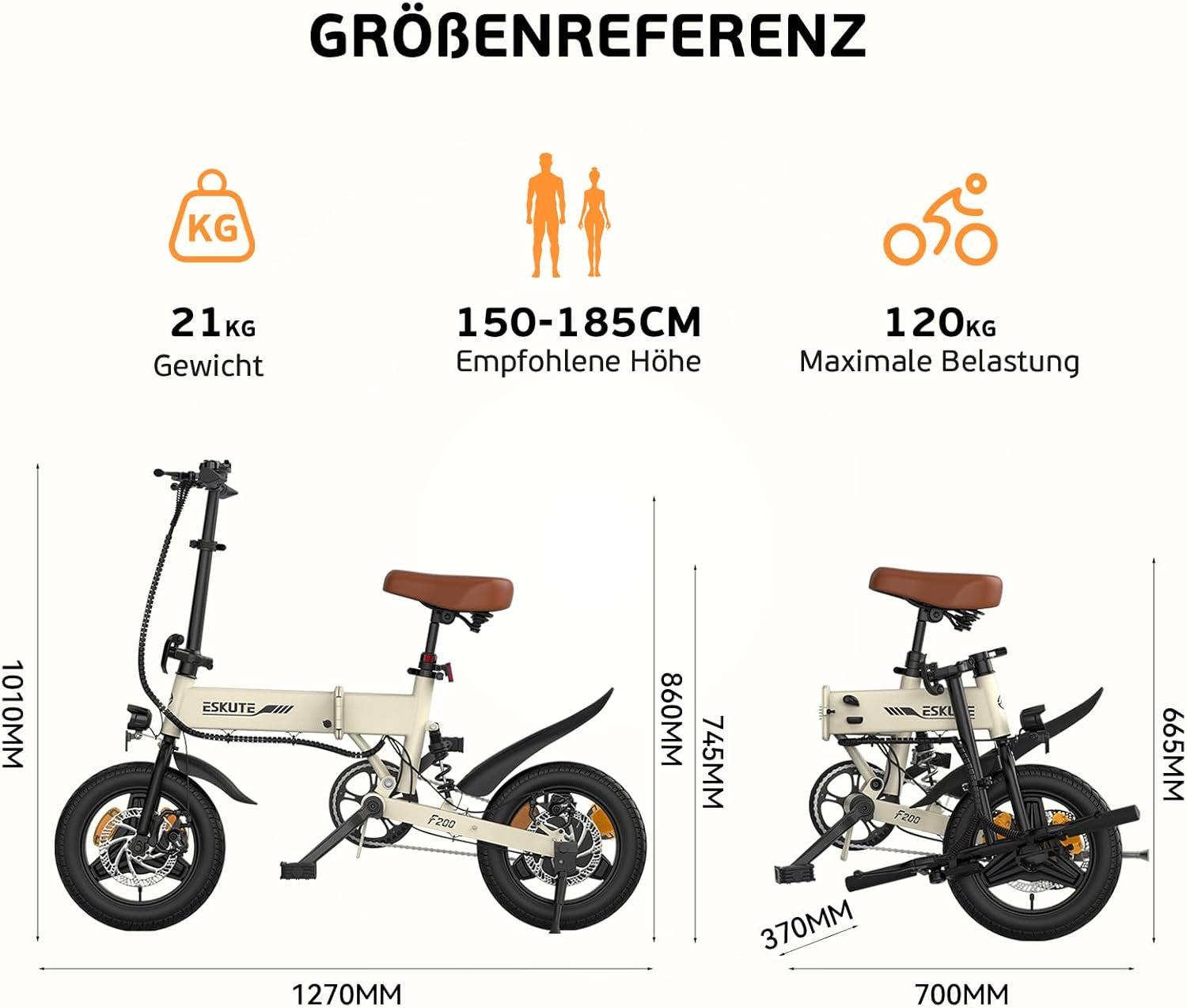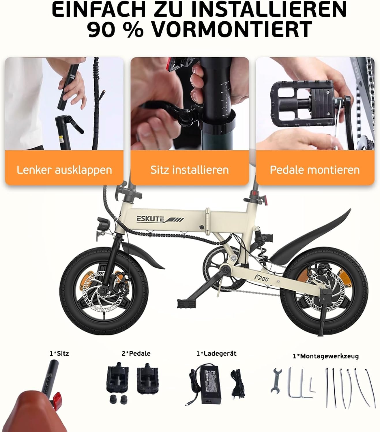 ESKUTE F200 Klapp-E-Bike 14 Zoll, 36V 7,8Ah Akku, Reichweite 35–50 km, Handyhalterung & USB, Mini E-Bike für Erwachsene